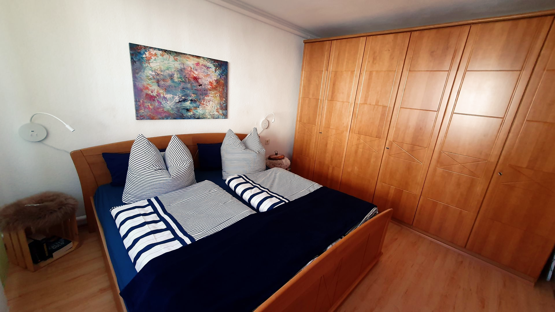 Das gemütliche Schlafzimmer bietet den idealen Rückzugsort für erholsame Nächte. Ein großer, geräumiger Kleiderschrank bietet viel Platz für Ihre Garderobe und persönliche Dinge – perfekt auch für längere Aufenthalte.